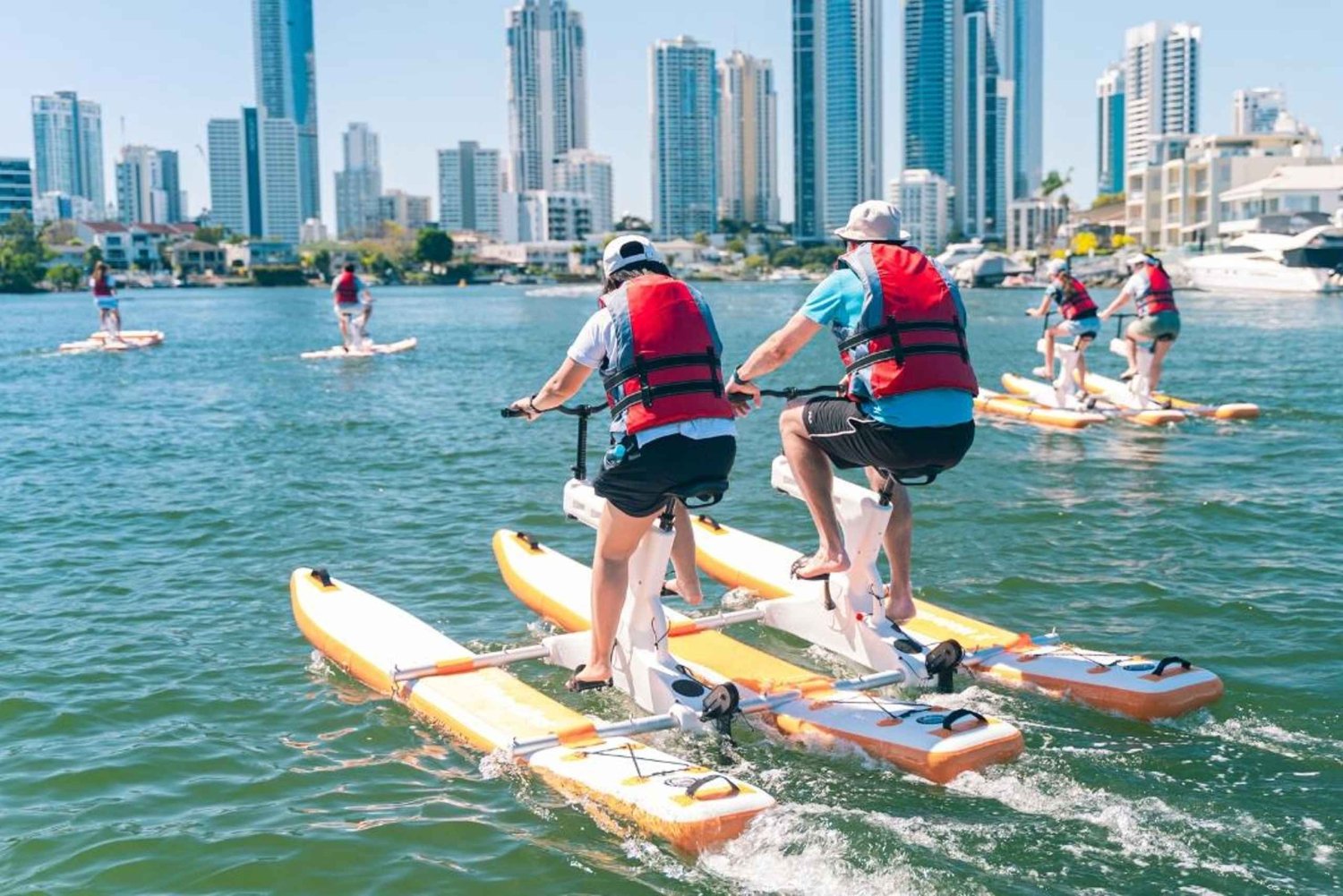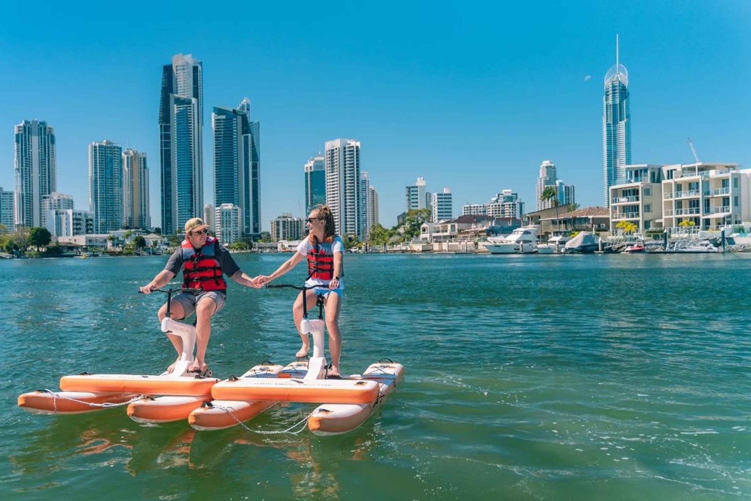 Experience the Gold Coast from a whole new perspective on this fun and peaceful 60 minute waterbike experience. Depart from the heart of Surfers Paradise and pedal your way along the iconic scenic waterways. Spot local wildlife, admire stunning riverside homes, and take in the magic of the Gold Coast skyline. Once at Budds Beach, take a short break to rest, rehydrate, and soak up the laid-back atmosphere. Your host will provide a chilled beverage and light snacks from the onboard esky, all included in your experience. You’re welcome to enjoy a refreshing swim in the calm waters before the return ride. You’ll also have the option to visit the popular Bumbles Café, located just across the road, to purchase a coffee, sweet treat, or extra refreshments (own expense) before cruising back to Surfers Paradise. Choose from a single waterbike or a two-person side-by-side model, perfect for families, friends, or couples who want to share the experience. With no fuel, no noise, and no fumes, it’s a calm and eco-friendly way to explore the Gold Coast waterways while enjoying a touch of exercise and plenty of fun in the sunshine.Includes
